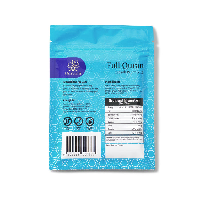 Package of Quranfi ruqyah papers (x16). Dilute the Quranic papers in water to create powerful ruqyah water to cast off and destroy sihr, al-ayn, and hasad.